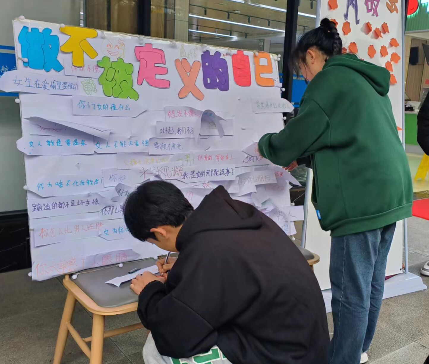 活动以贴满标签的展示板为呈现形式,呼吁大家撕掉偏见“标签”,写上祝福的话语,倡导大家做不被定义的自己。刚刚下过大雨的校园,空气中充满了清新的气息。虽然天气较为寒冷,但同学们的热情却丝毫不减。活动中,同学们纷纷撕下充满“恶意”的标签,随后在便利贴上留下鼓励自己和他人的暖心话语,用最美好的祝福消除偏见和误解。时间一点点的过去,鼓励与温暖的话语很快就填满了白色展板,汇成了一股股暖流,缓缓流淌在每一个同学的心中。“在日常生活中,‘这类’‘那类’的刻板印象强制定义了太多的鲜活个体,我们的内心被束缚,渐渐失去了去做喜欢事情的勇气。”机电学院丛鑫同学表示,“作为新时代的青年人,要勇于撕掉标签,远离定义,永葆对生活的热爱与信心。”